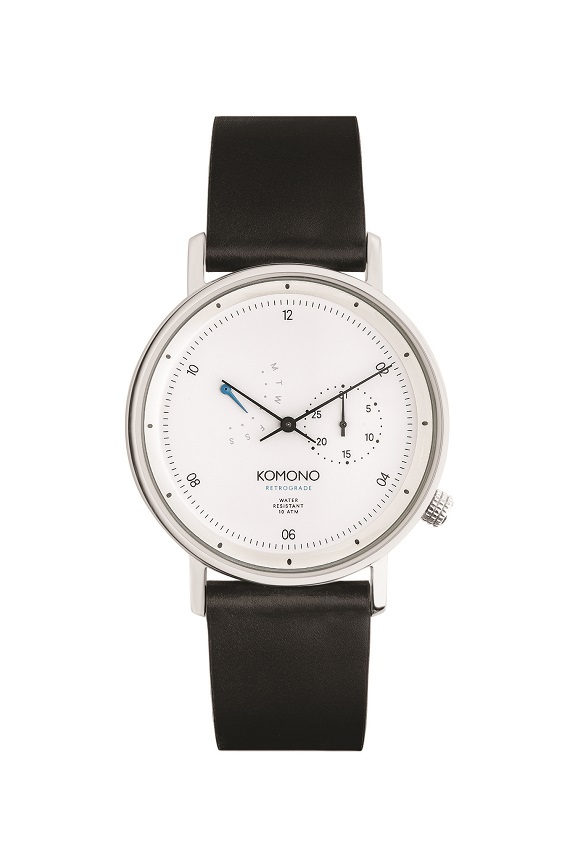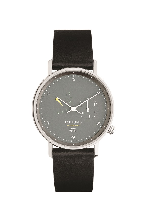Komono, belgická značka hodinek, slunečních brýlí a brýlových obrub, představuje nejnovější řadu hodinek Walther Retrograde, jejímž charakteristickým prvkem je naprosto unikátní systém kalendáře. Nadčasový minimalismus klasické řady Komono Walther zvýrazňuje jemná datumovka neobvykle pojatá jako ciferník ve stylu chronografu a speciální barevný kalendář pro dny v týdnu. Design hodinek Walther Retrograde rozehrává sofistikovanou hru minimalismu, barev a originálních funkčních elementů. Hodinky Komono Walther Retrograde jsou dostupné ve třech klasických barevných variantách – černá, bílá a modrá. Tyto luxusní hodinky mají speciální klenuté minerální sklo se safírovým povrchem, které je několinásobně odolnější vůči poškrábání, japonský quartzový strojek v pouzdře z 316L nerez oceli a odepínací kožený pásek. Průměr ciferníku: 40 mm. Vodotěsnost: do 10 ATM (plavání, šnorchling, surfing). www.komono.com
