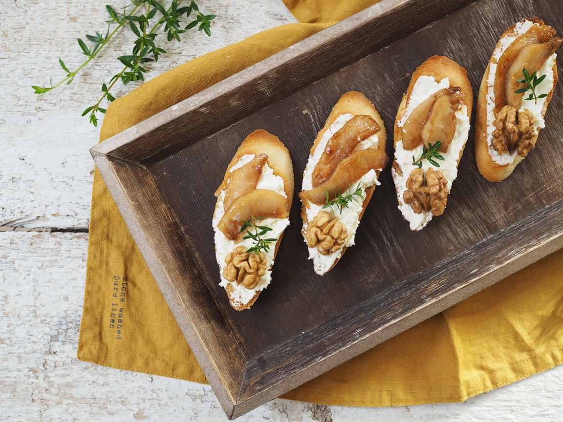 V misce smícháme 3 lžíce změklého másla s bylinkovou solí. Na plátky nakrájenou bagetu potřeme bylinkovým máslem a v troubě na 170 stupňů necháme cca 10 minut opéct do zlatova. Na pánvi rozehřejeme lžičku másla, na kterém orestujeme oloupané a na měsíčky nakrájené hrušky. Poté přidáme balzamikový krém a necháme ho zredukovat. Na vychladlé bagetky namažeme kozí sýr, ozdobíme plátky restovaných hrušek, půlkou vlašského ořechu a snítkou tymiánu.