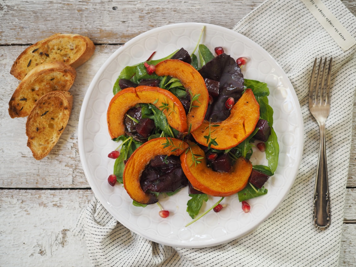 Salát s granátovým jablkem, pečenou řepou a dýní