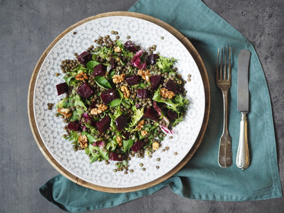 Salát s čočkou, ořechy a červenou řepou marinovanou