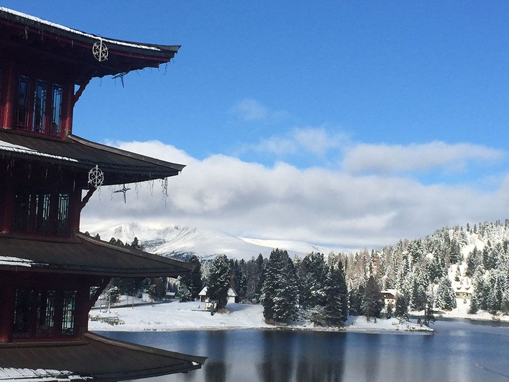 Hned druhá věc, která vás z dálky na Turrachu upoutá, je pagoda s červenou střechou na břehu jezera. Rovněž patří hotelu Hochschober, a tato čtyřpodlažní věž je jedinou autentickou čínskou stavbou v Alpách. Původně měla být čajovnou v čínském stylu. Právě do těch se totiž na svých cestách na začátku 90. let minulého století zamiloval majitel Hochschoberu Peter Leeb, který navázal na sen svého otce: vybudovat v Evropě zcela jedinečné středisko odpočinku spojující to nejlepší z celého světa. Zajímal se také o metody tělesného a duševního uvolnění z Říše středu. V roce 2005 tak vyrostla na břehu jezera čínská pagoda, která tohle vše nabízí: v 1. patře najdete odborníky na tradiční čínskou medicínu, ve 2. si můžete dopřát masáže, ve 3. se medituje a cvičí jóga pod dohledem špičkových jogínů a ve 4. patře našla své místo čajovna s tím nejkrásnějším výhledem na alpské velikány.