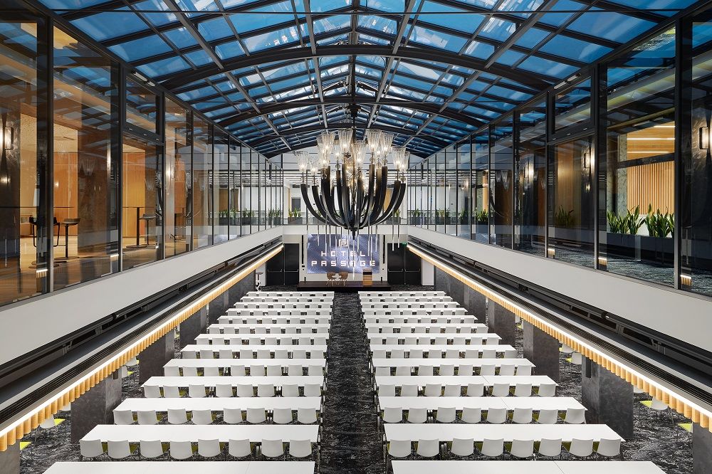 Lustry v konferenčním sále – ideovou předlohou byla strohá, funkcionalistická forma svítidel z roku 1930, které jsou instalovány v budově Vrchního soudu v Praze. Inspirací je tedy předmět datovaný do stejné doby, jako samotný brněnský hotel Passage. Monumentalita lustru je tvořena 16 velkými, kovovými rameny o rozvinuté délce 165 cm, která jsou na vrcholu osazena tzv. skleněnými tulpnami z českého křišťálu s ručně vybroušeným dekorem. Celkovou kompozici svítidla doplňují křišťálové prizmy zavěšené z jednotlivých ramen.