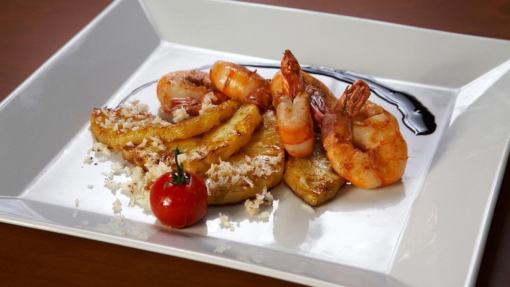 Grilované krevety na olivovém oleji s kousky sweet ananasu a kokosu
