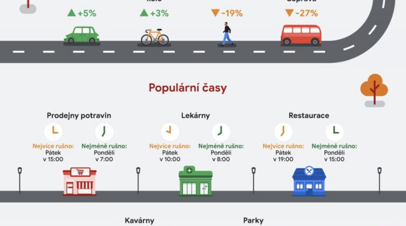 Společnost Google teď zanalyzovala data z Map Google z období od března do října letošního roku, které ilustrují změny v pohybu lidí, nakupování i trávení času během koronavirové pandemie v České republice. Vyplývá z nich například, ve kterou dobu mohou lidé očekávat největší návaly v obchodech s potravinami či restauracích, ale třeba také, jak se meziročně změnil zájem o různé způsoby dopravy.