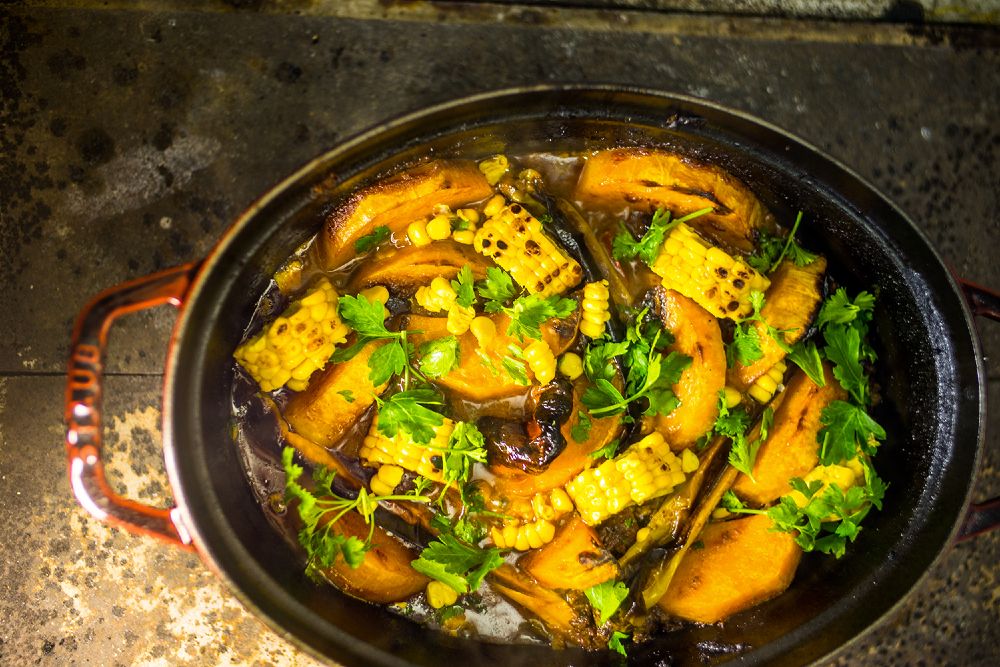 Vlijeme víno, necháme ho vyvařit, přilijeme vývar a rajčata, přidáme rajčatový protlak, osolíme a opepříme. Zvýšíme teplotu. Až se směs začne vařit, přiklopíme ji a ztlumíme teplotu na nízký stupeň. Necháme probublávat zhruba 20 minut. Dýni nakrájíme na kostičky a vmícháme ji po 10 minutách k masu. Dusíme, přidáme fazole a povaříme ještě 10 minut.