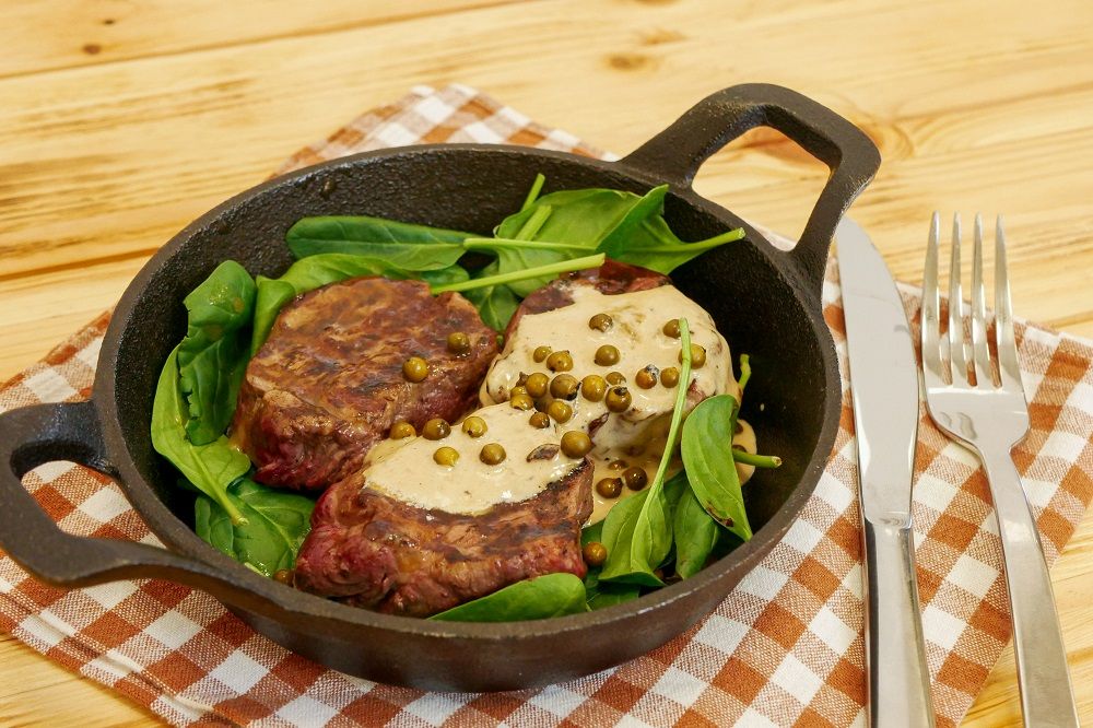 Zredukujte hovězí vývar na polovinu. Mezitím rozpusťte máslo ve velké pánvi na středním plameni. Steaky osolte a opepřete. Opečte je na požadovanou propečenost, u medium-rare asi 4 minuty z každé strany. Přeneste steaky na nahřátý talíř. Do stejné pánve přidejte nakrájenou šalotku a restujte 2 minuty. Odstraňte z tepla. Přidejte zredukovaný hovězí vývar, šlehačku, 3 lžíce koňaku a zrnka zeleného pepře. Vařte, dokud směs nezhoustne na konzistenci omáčky – asi 6 minut. Podle chuti dochuťte pepřem. Nalijte omáčku na steaky a podávejte se salátem nebo pečenými bramborami.
