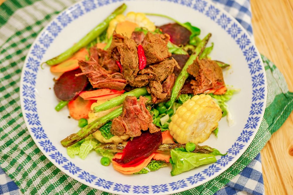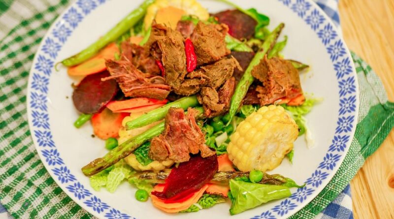 Uvařte silný vývar k masu, ale snažte se ho nepřesolit. Připravte si velký formát alobalu, na který položíte maso nakrájené na silnější plátky. Podlijte ho dostatečným množstvím vývaru. Přidejte cibuli nakrájenou na tenké plátky, červenou papriku a okořeňte (opět buďte opatrní se solí, protože vývar také udělá své). Alobal dobře zabalte a pečte v troubě na 130 stupňů přibližně 4 hodiny. Červenou řepu uvařte, mrkev nastrouhejte, hlávkový salát nakrájejte na tenké nudličky a přidejte ostatní ingredience. Okořeňte podle chuti a podávejte s trhaným, pečeným masem.