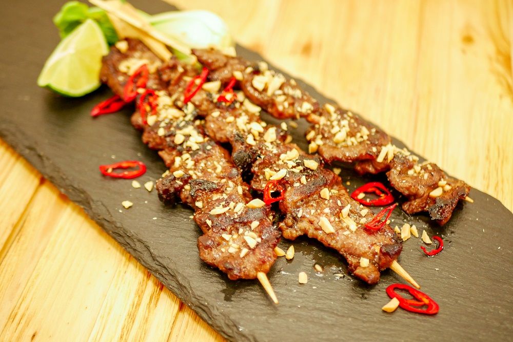 Maso nakrájejte na tenké plátky přes vlákno. Marinujte 2–3 hodiny ve směsi sójové omáčky s pálivou omáčkou sriracha, povidly, drceným česnekem a šťávou z limetky. Plátky masa navlékejte na špíz cik cak a zprudka opečte na grilu nebo grilovací pánvi z obou stran. Servírujte ozdobené drcenými arašídy, koriandrem a jarní cibulkou. Podávejte samotné nebo třeba s pečenými bramborami.