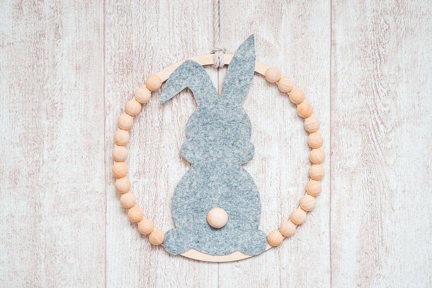 Vystřihneme z papíru obrys zajíčka a překreslíme ho na filc. Zajíčka z filcu vystřihneme a přilepíme ho na dřevěný kruh. Dáváme pozor na to, abychom filc dobře napnuli. Po celém obvodu kruhu nalepíme tavnou pistolí dřevěné polokoule. S lepidlem zacházíme opatrně, aby lepidlo zbytečně nepřetékalo a neničilo výsledek. Přilepíme jednu polokouli zajíčkovi jako ocásek. Na závěr stačí provléknout provázek na zavěšení a najít této jednoduché, ale efektní dekoraci to správné místo.