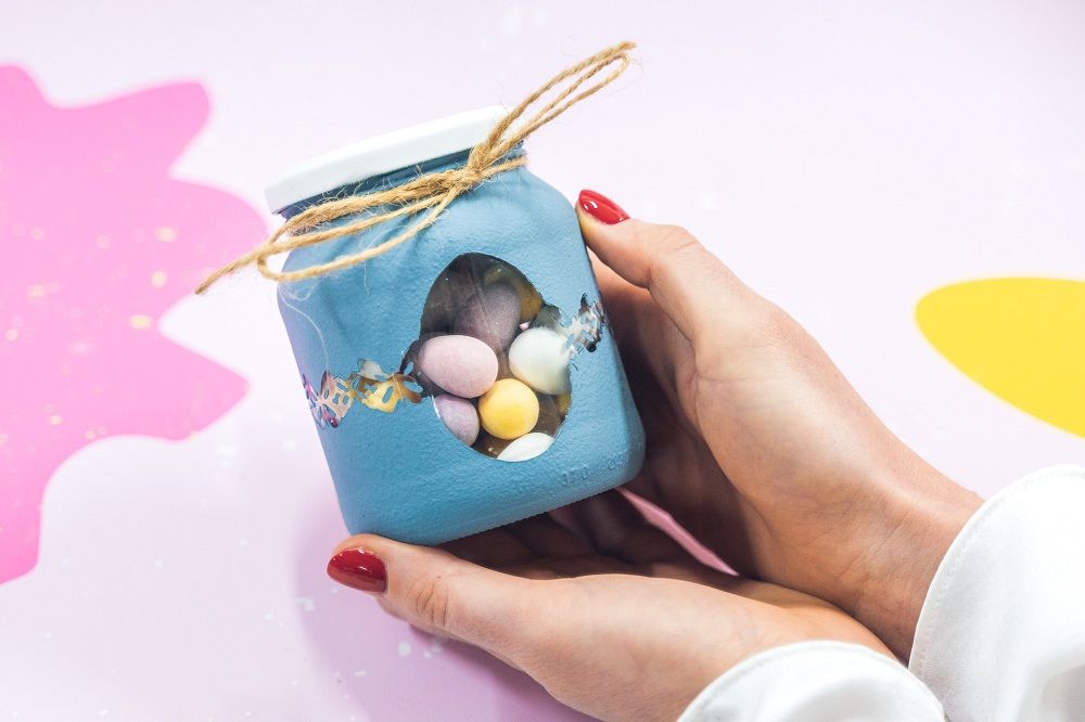 V dobře větrané místnosti nebo venku si jako první nastříkáme křídovou barvou ve spreji víčko skleničky. Možná bude třeba barvu aplikovat ve více vrstvách, dbejte tedy na to, aby jednotlivé vrstvy mezi aplikacemi dobře uschnuly. Barva tak bude lépe držet i vypadat. Skleničku dobře očistíme od původní etikety (Tip: nechte odmočit sklenici v roztoku horké vody s klasickým jarem a etiketa se lépe odlepí). Chceme na sklenici vytvořit místa s průhledem a ty je třeba nejdříve zakrýt. Hlavní motiv (v našem případě tvar vajíčka) vystřihneme z papíru a nalepíme na sklenici. Po obvodu sklenice nalepíme ozdobnou krajkovou washi pásku. Nyní nanášíme křídovou barvu pomocí tupovací houbičky. Ty na povrchu vytváří zajímavý reliéf. Pro dokonalé krytí můžete barvu nanést ve dvou vrstvách. Jakmile barva dobře zaschne, můžeme opatrně sloupnout krytí ploch. Můžeme si pomoci pinzetou nebo ulamovacím nožem. Skleničku můžeme dále dotvořit dle naší fantazie pomocí provázku, krajek nebo stužek. Nasypeme do ní dobroty, zavíčkujeme a máme hotovo.