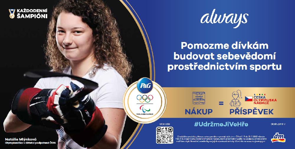 Značka Always, jejímž heslem je dodávat ženám sebevědomí a stát při nich během všech jejich aktivit, se proto rozhodla dospívající dívky podpořit, aby už žádný talent nezůstal nevyužitý a žádný sportovní sen nesplněný. Pokud i vám záleží na tom, aby mladé dívky nepřicházely o možnost sportovat, můžete je podpořit v rámci nové kampaně značky Always i vy. Stačí, když během července zakoupíte dámské hygienické potřeby Always v drogeriích DM a automaticky přispějete České olympijské nadaci, která vybranou částku použije na podporu dívek v ČR, aby u sportu zůstaly. Příspěvek poputuje dívkám ve věku 11 až 18 let, a to například formou příspěvku na soustředění, kempy, sportovní pomůcky, oddílové příspěvky a jiné nezbytnosti, které tyto dívky potřebují.
